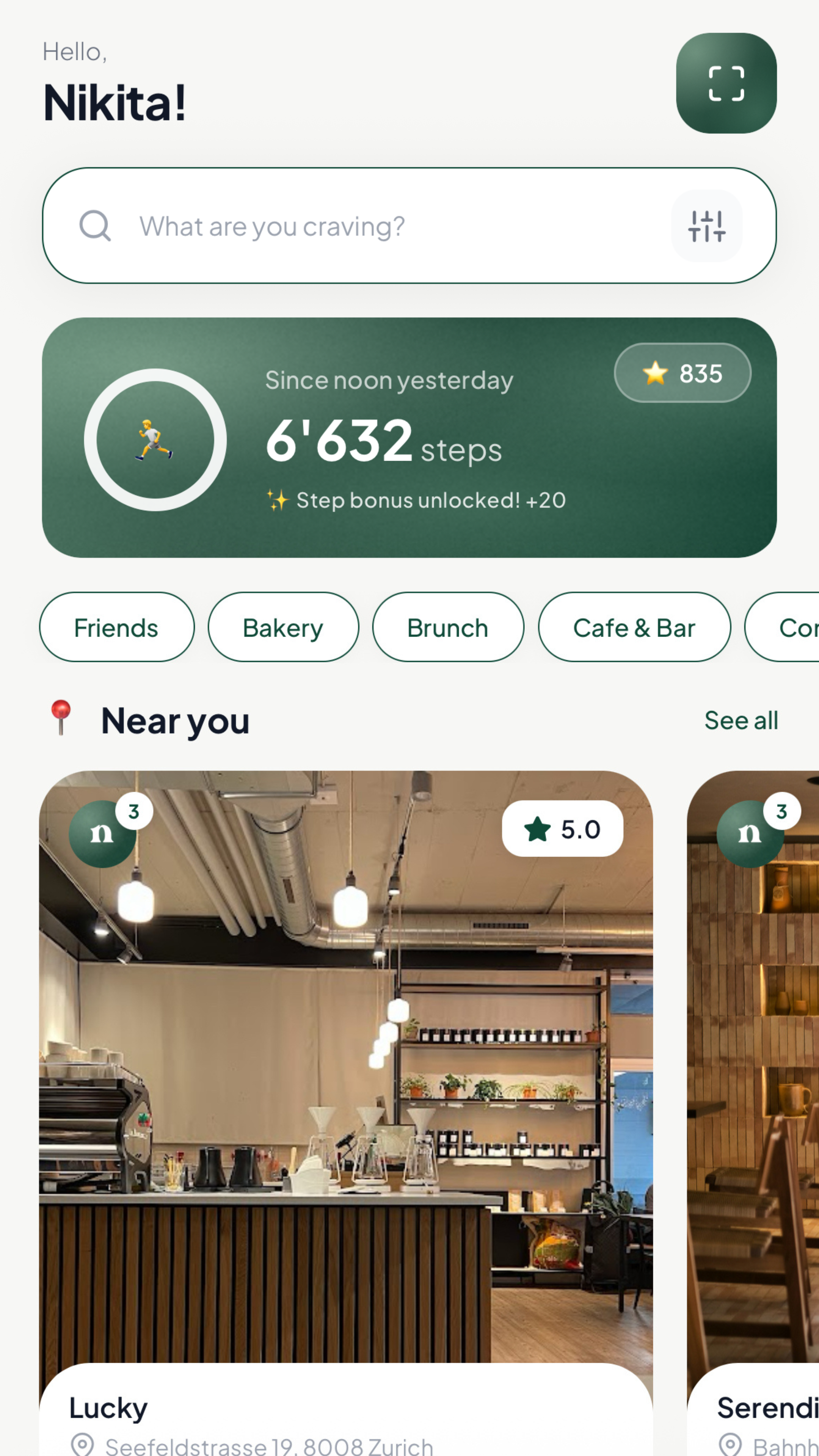 Hit 5,000 steps and earn bonus points on your next coffee. Your daily walk just got more rewarding.